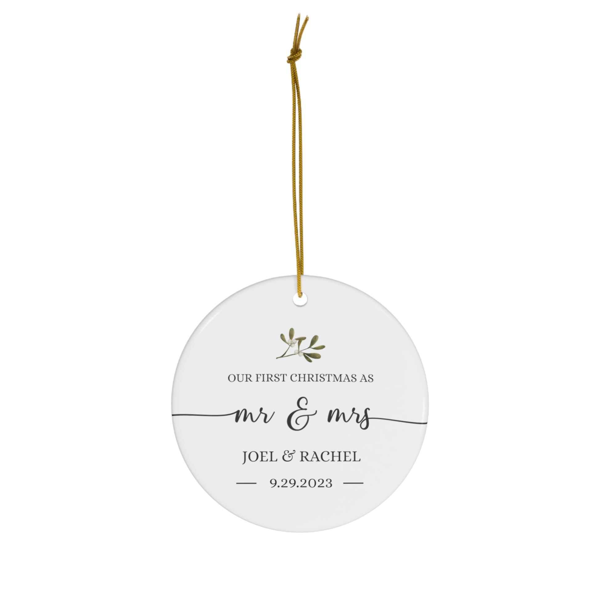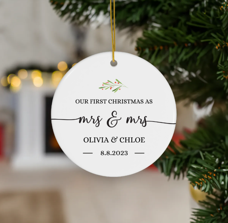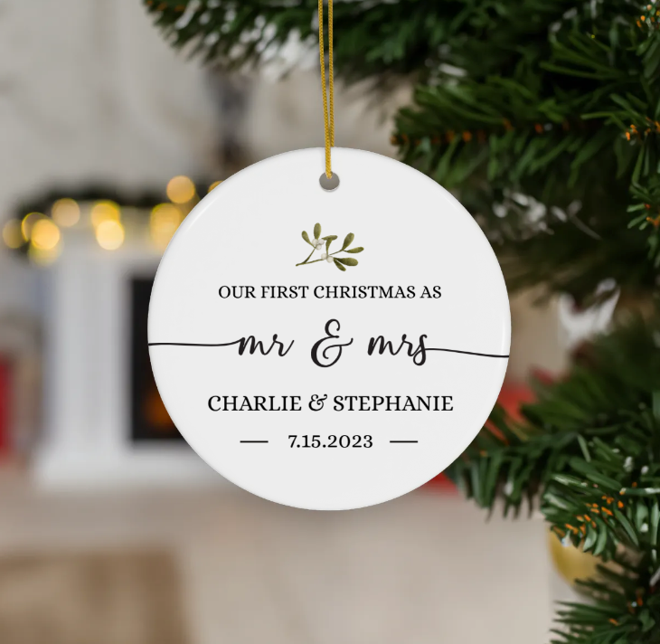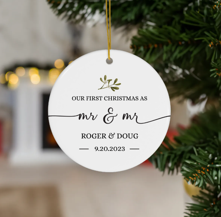 These custom-made Christmas ornaments can be the perfect heirloom to use year after year, generation after generation. Choose from "Mr. & Mrs." "Mrs. & Mrs." or "Mr. & Mr." These high quality ceramic ornaments will be cherished for years to come.